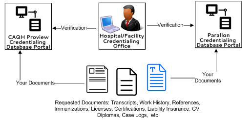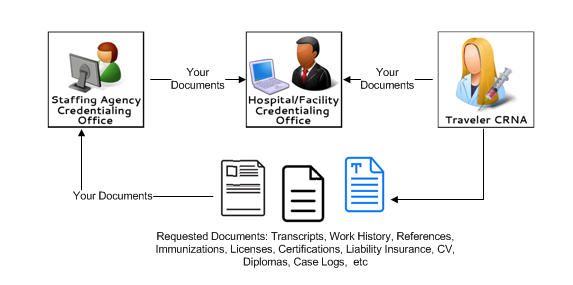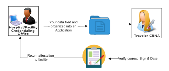 The Facility Credentialing Office will request a myriad of documentation specific to your qualifications, education, immunizations, etc., organize the information into an application, then request your attestation of the compiled information. This can be accomplished in various ways. Your Staffing Agency may have some of the documentation or request it from you and provide it to the Facility. Or the Facility may reach out to you directly. See the below flow diagram. The documentation that will be requested varies with the facility. Click for a list of what you should always have current, up-to-date, and ready to provide.